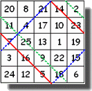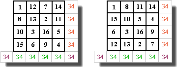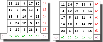 Pourtant, quand on pense carrés magiques, on pense d'abord aux carrés magiques de nombres : ![]() On constate en outre que cette somme ne dépend pas de la disposition des nombres. En voici deux autres d'ordre 5 : ![]() On constate encore sur ces deux exemples que la valeur de la somme, appelée pour cette raison "constante du carré" ne dépend que de la dimension du carré. Les carrés magiques ici présentés sont qualifiés de "normaux" : ils comprennent tous les nombres de 1 à 25 pour le carré de 5, par exemple. La constante du carré de 3 est c = 15, celle du carré de 4 est c = 34, celle de 5 vaut c = 65... Peut-on prévoir la valeur de cette somme pour un carré de n'importe quelle dimension ? 20 par exemple ? Oui, bien sûr ! Il faut faire la somme de tous les nombres de 1 à 400 (20 x 20) et diviser cette somme par 20 puisqu'il y a 20 lignes (ou 20 colonnes) : c'est aussi une "devinette" qu'on donne aux élèves de 6eme pour des carrés de dimensions modestes (5 ou 6) : test du "sens de la division"... Donc ici : 1 + 2 +3 + 4 +..........+ 400 = 40200 et divisé par 20 : 2010... Mais c'est quand même un peu long ! N'y a-t-il pas de moyen plus rapide ? Si, mais là c'est un peu plus subtil... Il f"suffit" d'écrire deux fois la somme, une fois dans l'ordre croissant et une autre fois dans l'ordre décroissant : S = 1 + 2 + 3 +....... + 400 S = 400 + 399 + 398 + .......+ 1. et de remarquer que, si on ajoute ces deux sommes on obtient 400 fois le nombre 401 (test du sens de la "multiplication"), donc la valeur de la somme est (401 x 400)/2 (puisqu'il y a deux fois la somme) qu'il faut encore diviser par 20 pour trouver la constante du carré, ici 2010. Pour les amateurs de "sensations fortes", signalons qu'on peut établir une formule universelle à partir de la dimension n du carré : La somme 1 + 2 + 3 + ...+ n2 est la somme des n2 premiers termes d'une suite arithmétique de premier terme 1 et de raison 1 qui vaut |