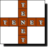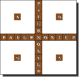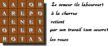 Par sa présence à Rennes-le-château, il a été associé par certains au mystère du "Trésor des Templiers". Qu'il ait été retrouvé à Pompei, enseveli par l'éruption du Vésuve en 79 ap. J.C, prouve son antériorité à cette date... Le premier, un pasteur saxon, Felix Grosser, lui attribua en 1925, une signification religieuse. Il nota que le mot TENET était disposé en croix, et que ce carré soit composé de palindromes, lui donna l'idée de composer une autre croix : |