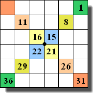 Ainsi on peut choisir d'inscrire tous les nombres impairs dans la moitié supérieure et tous les nombres pairs ensuite. Mais le remplissage pairs/impairs par quadrants donne un carré presque magique... - Examiner la répartition pairs/impairs dans le carré obtenu. Voici ce que donnent pour n = 18 les deux modes ci-dessus :