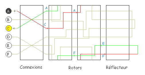 - on traverse le réflecteur où on obtient E, puis on renvoie dans les rotors pour obtenir F, A et finalement C après le tableau de connexions.