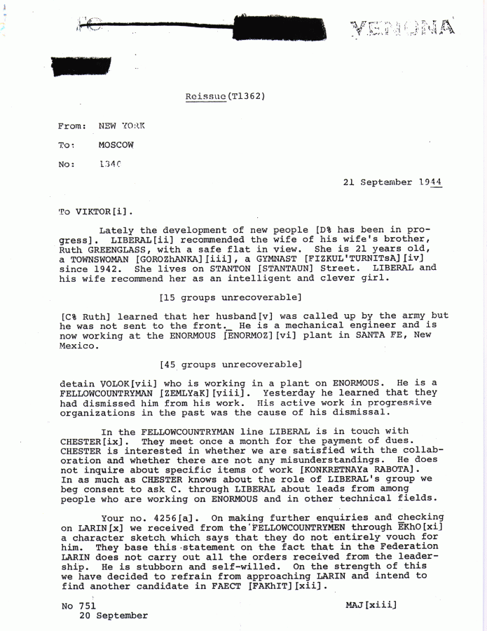 Cela dit, tout n'est pas si clair dans l'exécution des deux époux. Par exemple, si la culpabilité de Julius Rosenberg semble avérée, celle de sa femme l'est beaucoup moins. Les documents issus du projet Venona semblent lui donner un rôle mineur. Voici justement ci-dessous un des documents (ils se trouvent tous sur le site de la NSA) :