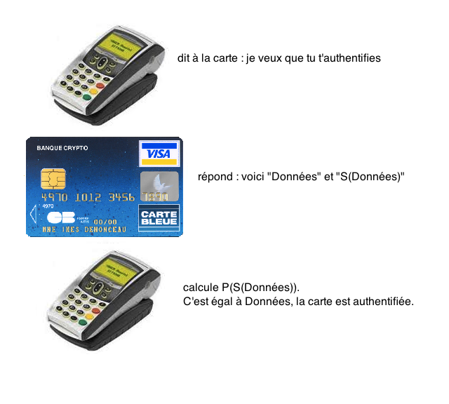 la clé publique P du groupement des cartes bancaires, "P(S(données))" et vérifier si cela est bien égal à "données". Si c'est le cas, c'est que la carte est valide,