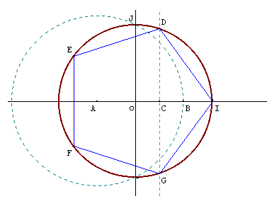 $A$ est le point de coordonnées $(-1/2,0),$ $B$ est l'intersection du cercle de centre $A$ passant par $J.$ $C$ est le milieu de $[OB].$ Il est facile de prouver que $OC=(-0,5+\sqrt{5/4})/2$ et ceci est exactement $\cos(2\pi/5)$.