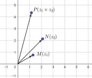 Si $M$ a pour affixe $z_1$, $N$ a pour affixe $z_2$ et $P$ a pour affixe $z_1\times z_2$, avec $z_1=r_1e^{i\theta_2}$ et $z_2=e^{i\theta_2}$, alors $z_1z_2=r_1r_2e^{i(\theta_1+\theta_2)}.$ On ajoute les angles (arguments), on multiplie les normes (modules).