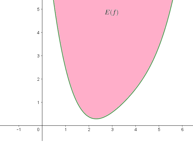 L'épigraphe d'une fonction $f$ définie sur un intervalle $I$ et à valeurs dans $\mathbb R$ est la partie du plan suivante : $$E(f)=\{(x,y)\in\mathbb R^2:\ x\in I\textrm{ et }y\geq f(x)\}.$$ Autrement dit, l'épigraphe est la partie "au-dessus" de la courbe représentative de $f$.