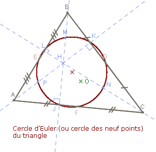 Dans ce même triangle, les milieux des côtés du triangle $ABC,$ les milieux des segments $[AH],$ $[BH]$ et $[CH],$ où $H$ est l'orthocentre, et les pieds des 3 hauteurs sont sur un même cercle : le cercle d'Euler du triangle. Le centre de ce cercle est sur la droite d'Euler : c'est le milieu de $[OH]$ où $O$ est le centre du cercle circonscrit.
