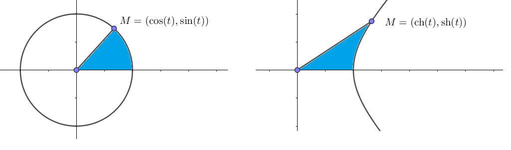 Le nom "fonction hyperbolique" vient essentiellement de la relation $\textrm{ch}^2-\textrm{sh}^2=1$, qui fait que les fonctions $\textrm{ch}$ et $\textrm{sh}$ jouent pour l'hyperbole $x^2-y^2=1$ le même rôle que les fonctions $\sin$ et $\cos$ pour le cercle unité $x^2+y^2=1$ ($\sin$ et $\cos$ sont parfois appelées fonctions circulaires). Par exemple, si $M$ est le point de coordonnées $(\cos(t),\sin(t))$ sur le cercle trigonométrique, avec $t\in[0,\pi/2]$, alors $2t$ est égal à l'aire du domaine délimité par le cercle, le segment $[OM]$ et son symétrique par rapport à l'axe des abscisses. De même, si $M$ est le point de coordonnées $(\textrm{ch}(t),\textrm{sh}(t))$ sur l'hyperbole $x^2-y^2=1$, avec $t\geq 0$, alors $2t$ est égal à l'aire du domaine délimité par l'hyperbole, le segment $[OM]$ et son symétrique par rapport à l'origine.