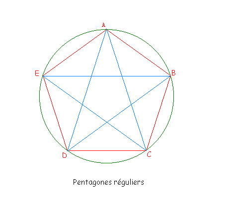 - Le pentagone régulier et le pentagramme : dans un cercle, on peut inscrire deux pentagones réguliers : un pentagone régulier convexe (en rouge sur le dessin), et un pentagone régulier étoilé (en bleu).