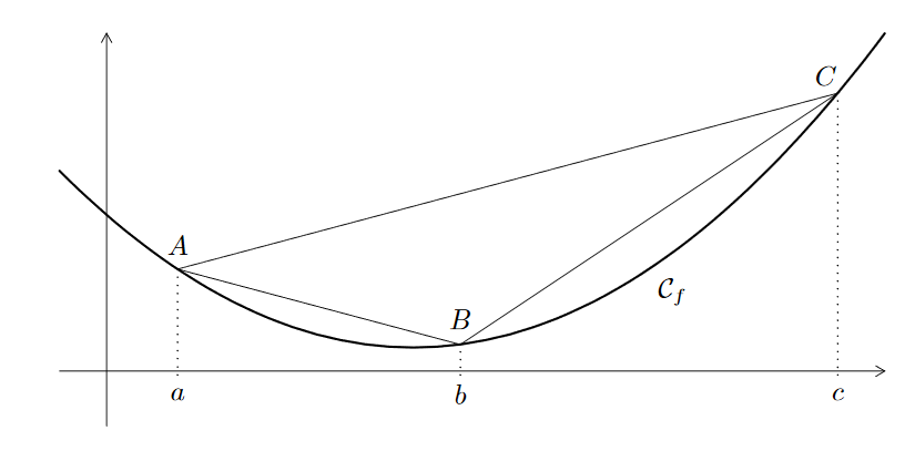 L'inégalité des pentes est une inégalité portant sur les pentes des cordes des fonctions convexes. Elle s'énonce ainsi : soit $I$ un intervalle et $f:I\to\mathbb R$. Alors $f$ est convexe sur $I,$ si et seulement si, pour tous réels $a,b,c$ de $I$ avec $a<b<c$, alors on a $$\frac{f(b)-f(a)}{b-a}\leq \frac{f(c)-f(a)}{c-a}\leq \frac{f(c)-f(b)}{c-b}.$$ Ceci s'illustre géométriquement comme sur la figure suivante :