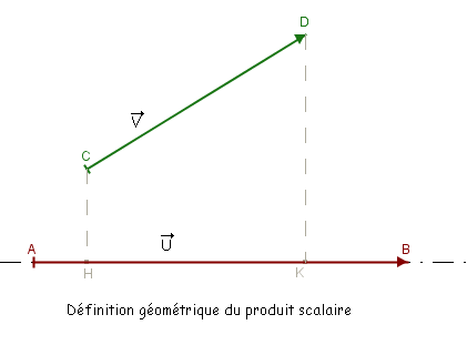 Dans le plan usuel, pour lequel on a la notion d'orthogonalité, on considère deux vecteurs $\vec u$ et $\vec v$. On choisit $\overrightarrow{AB}$ un représentant de $\vec u$, et $\overrightarrow{CD}$ un représentant de $\vec v$. Le produit scalaire de $\vec u$ et de $\vec v$, noté $\vec u\cdot \vec v$ est alors défini de la façon suivante : soit $H$ le projeté orthogonal de $C$ sur $(AB)$, et $K$ le projeté orthogonal de $D$ sur $(AB)$. On a $$\vec u\cdot \vec v=\overline{AB}\times\overline{HK}$$ c'est-à-dire $\vec u\cdot \vec v=AB\times HK$ si les vecteurs $\overrightarrow{AB}$ et $\overrightarrow{HK}$ ont même sens, $\vec u\cdot \vec v=-AB\times HK$ dans le cas contraire.