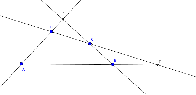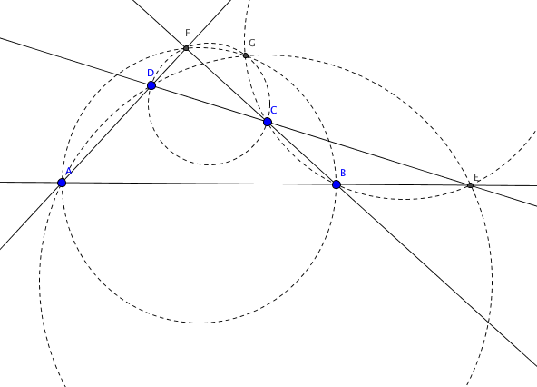 Théorème : Dans un quadrilatère complet $ABCDEF$, les cercles circonscrits aux triangles $EAD,$ $EBC,$ $FAB$ et $FDC$
