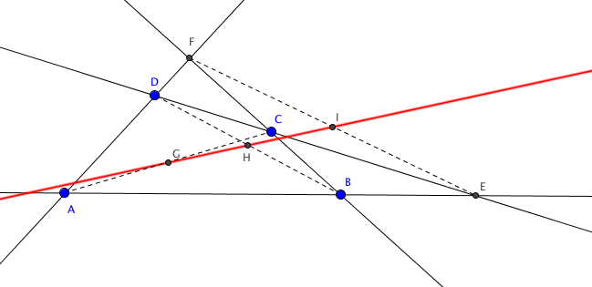 Théorème : Les milieux des trois diagonales d'un quadrilatère complet sont alignés sur une droite appelée droite de Newton du quadrilatère complet.