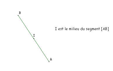 Dans le plan ou dans l'espace : Un segment désigne la portion de droite entre 2 points $A$ et $B$. On le note $[AB].$ Le milieu du segment est le seul point $I$ situé sur ce segment tel que $IA=IB.$ C'est aussi le point d'intersection du segment $[AB]$ avec la médiatrice de $[AB].$