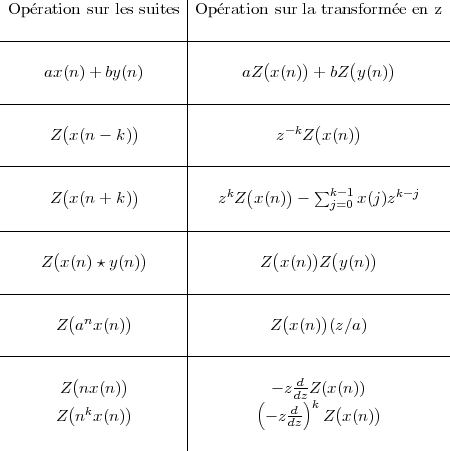 Voici une table des transformées en Z usuelles. On ne considère que des suites causales. $$\begin{array}{c|c|c} \textrm{Suites}&\textrm{Transformée en $z$}&\textrm{Domaine de convergence}\\ &&\\ \hline &&\\ u_0=1&&\\ u_n=0\textrm{ si }n>0&1&\mathbb C\\ &&\\ \hline &&\\ u_0=k&&\\ u_n=0\textrm{ si }n\neq k&z^{-k}&\mathbb C^*\\ &&\\ \hline &&\\ 1&\displaystyle \frac{z}{z-1}&|z|>1\\ &&\\ \hline &&\\ n&\displaystyle \frac{z^2}{z-1}&|z|>1\\ &&\\ \hline &&\\ a^n&\displaystyle \frac{z}{z-a}&|z|>a\\ &&\\ \hline &&\\ na^n&\displaystyle \frac{az}{(z-a)^2}&|z|>a\\ &&\\ \hline &&\\ \cos(\omega n)&\displaystyle \frac{z^2-z\cos(\omega)}{z^2-2z\cos(\omega)+1}&|z|>1\\ &&\\ \hline&&\\ \sin(\omega n)&\displaystyle \frac{z\sin(\omega)}{z^2-2z\cos(\omega)+1}&|z|>1\\ &&\\ \hline &&\\ a^n\cos(\omega n)&\displaystyle \frac{z^2-az\cos(\omega)}{z^2-2az\cos(\omega)+a^2}&|z|>a\\ &&\\ \hline&&\\ a^n\sin(\omega n)&\displaystyle \frac{az\sin(\omega)}{z^2-2az\cos(\omega)+a^2}&|z|>a\\ &&\\ \end{array}$$