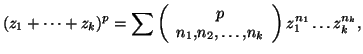 Théorème : Soient z1,z2,...,zk des nombres complexes (ou des éléments pris dans un anneau commutatif). On a l'identité multinômiale :