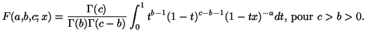 Soient a,b,c des réels, non entiers négatifs. La fonction hypergéométrique associée est la fonction définie par :