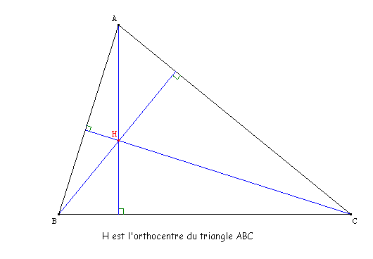 On définit de même les hauteurs issues de B, et de C. Alors les 3 hauteurs du triangle se coupent en un même point qui est l'orthocentre du triangle.