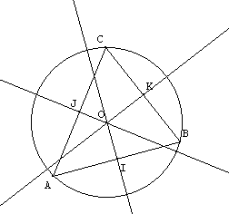 Dans un triangle ABC, les 3 médiatrices des segments [AB], [BC], [CA] sont concourantes, en un point qui est le centre du cercle circonscrit à ce triangle.