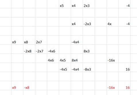 En divisant [tex]x^8-16[/tex] par [tex]x^4-2x^3+4x-4[/tex] on obtient [tex]x^4+2x^3+4x^2+4x+4[/tex].