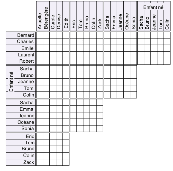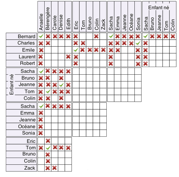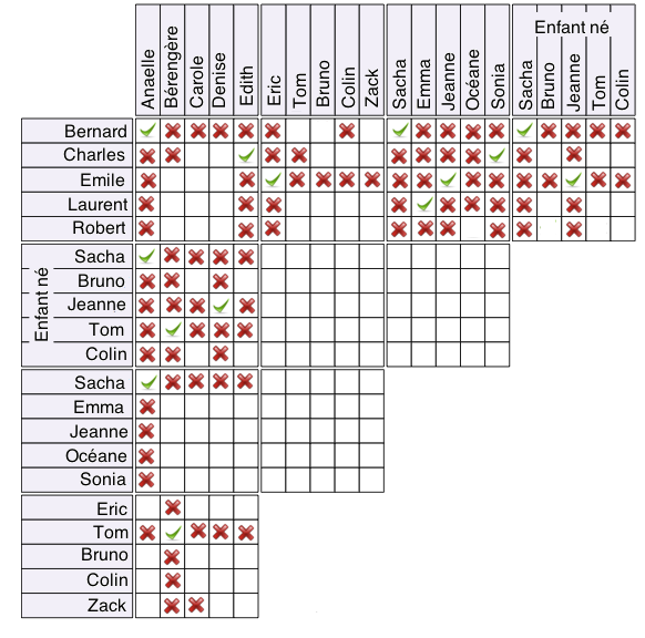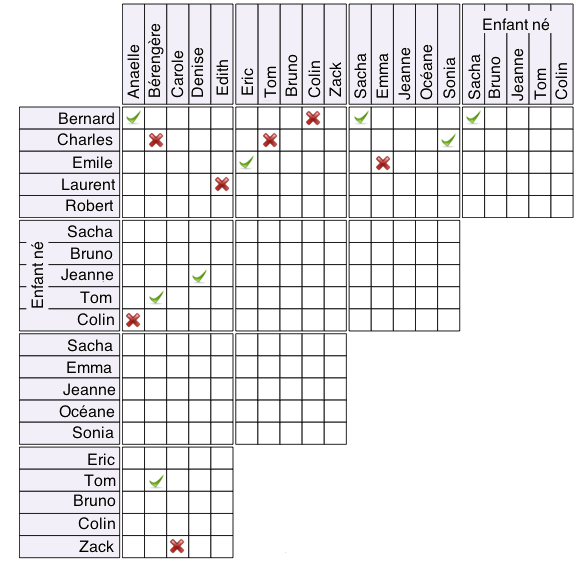 Cinq couples d'amis ont eu presque simultanément leur premier bébé. Comme ils ne voulaient pas savoir le sexe de leur bébé, ils avaient choisi avant la naissance un prénom de fille et un prénom de garçon. Saurez-vous, à partir des indications suivantes, reconstituer chaque couple, retrouver les prénoms qu'ils avaient choisi, et le prénom du bébé né ?