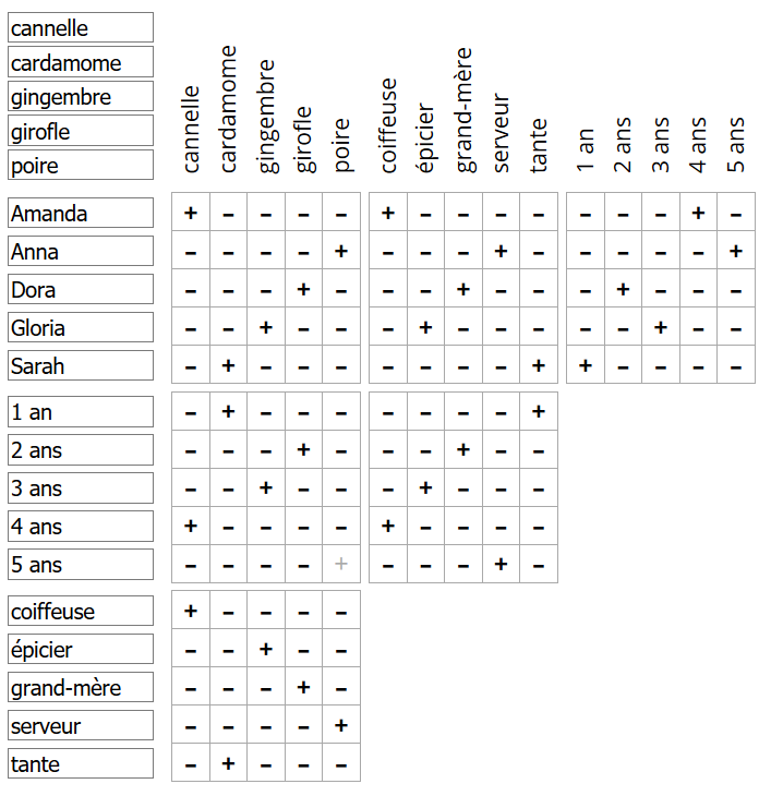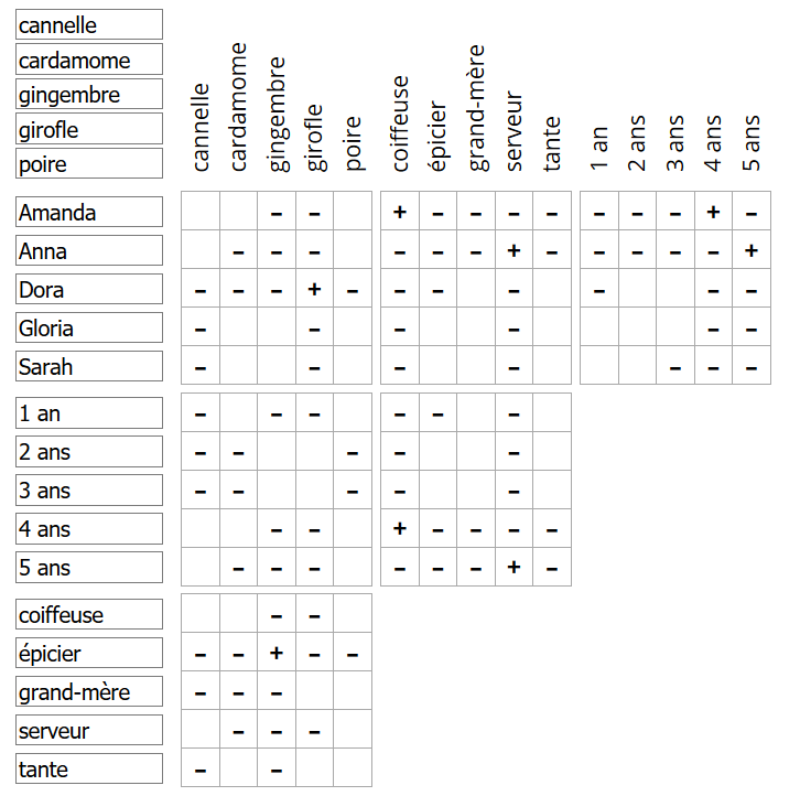 Cinq amies (Amanda, Anna, Dora, Gloria et Sarah) agrémentent chacune leur café avec une épice différente : cannelle, cardamome, gingembre, girofle et poivre. Elles tiennent leur recette chacune de quelqu'un de diférrent : la coiffeuse, l'épicier, leur grand-mère, un serveur ou leur tante. De plus, elles la consomment chacune depuis un nombre d'années différent, compris entre 1 et 5 ans. Comment ces cinq amies agrémentent-elles leur café ? À quelle épice recourent-elles et d'où leur vient cette recette ? Depuis quand consomment-elles ainsi leur breuvage ?