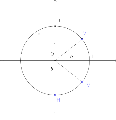 D'autre part, si on note $(a,b)$ les coodonnées de $M'$ dans le repère $(O,I,J)$, alors les coordonnées de $M'$ dans le repère $(O,H,I)$ sont $(-b,a)$, c'est-à-dire $(\sin x,\cos x)$. Puisque